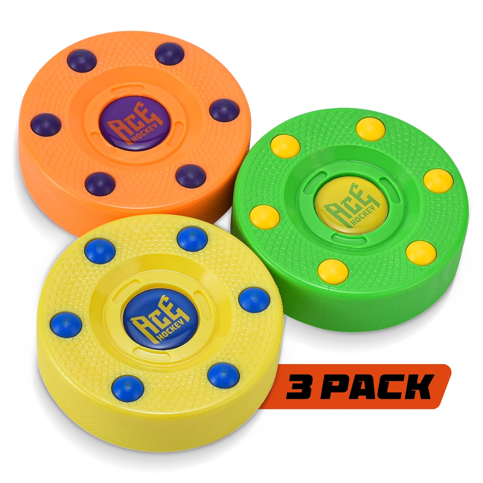 ACE HOCKEY ROLLER HOCKEY PUCKS – 3-PACK REGULATION SIZE – BRIGHT CITRUS COLORS