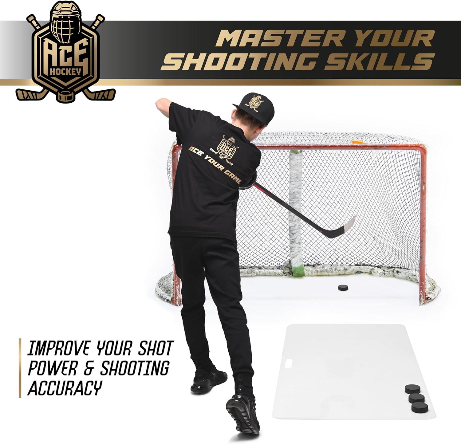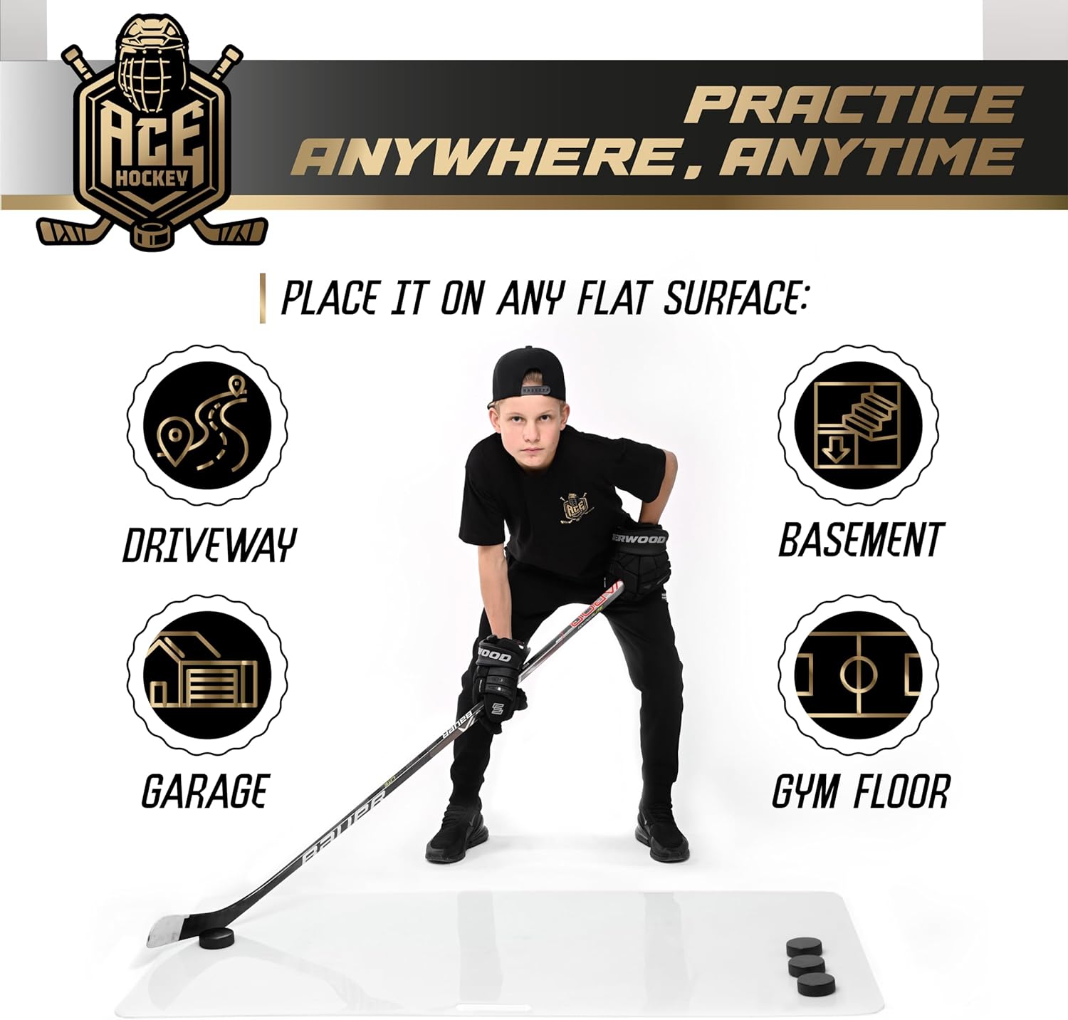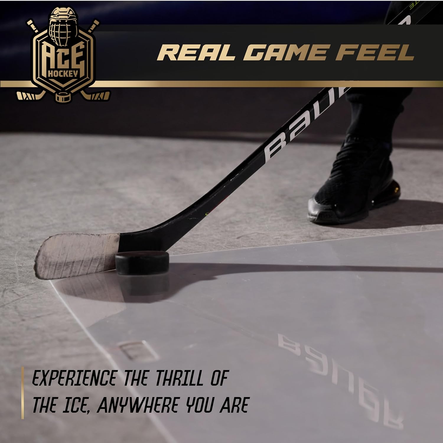 - GET THAT REAL ICE FEEL AT HOME: ACE HOCKEY Shooting Pad is designed to closely replicate the feel of real ice. It is incredibly smooth, ensuring that pucks glide similarly to real ice, which is essential for practicing shooting, stickhandling and passing skills